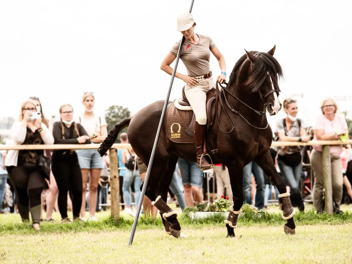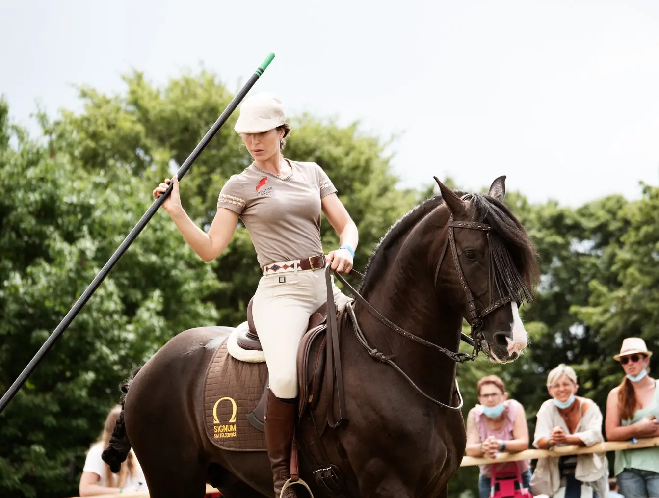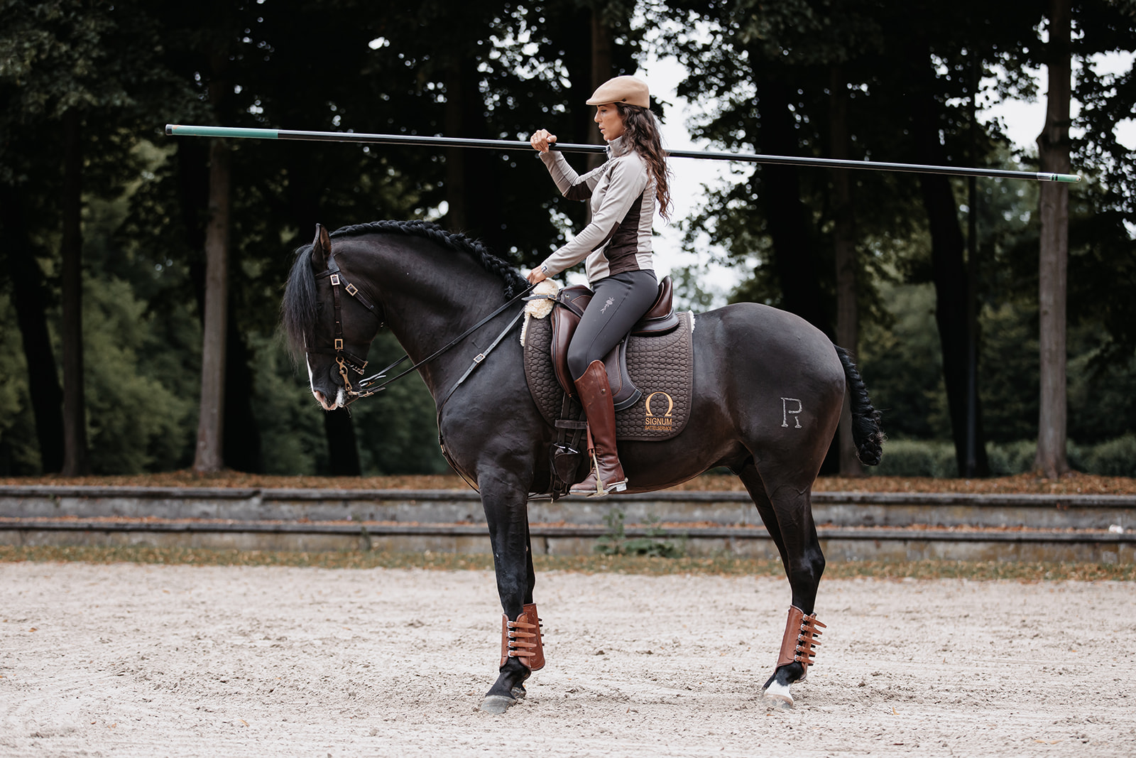 - Das Pferd muss schrittweise an die Garrocha gewöhnt werden, damit es keine Angst vor der Bewegung oder dem veränderten Schwerpunkt des Reiters entwickelt.