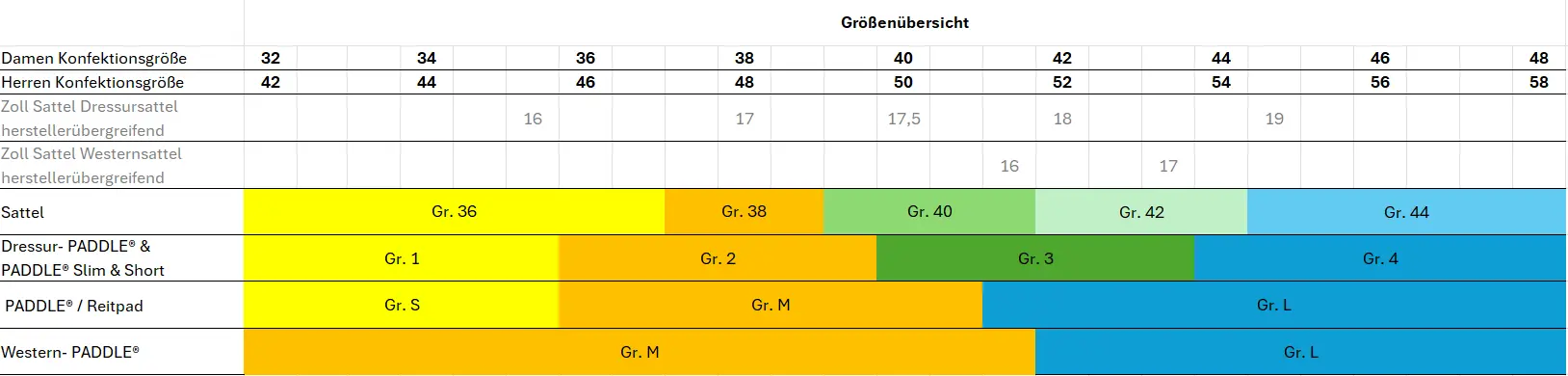 Die Größe der PADDLE® richtet sich im ersten Schritt nach der Konfektionsgröße des Reiters. Es wird grundsätzlich zwischen PADDLE®-Modellen mit 3 und 4 Größenabstufungen unterschieden: