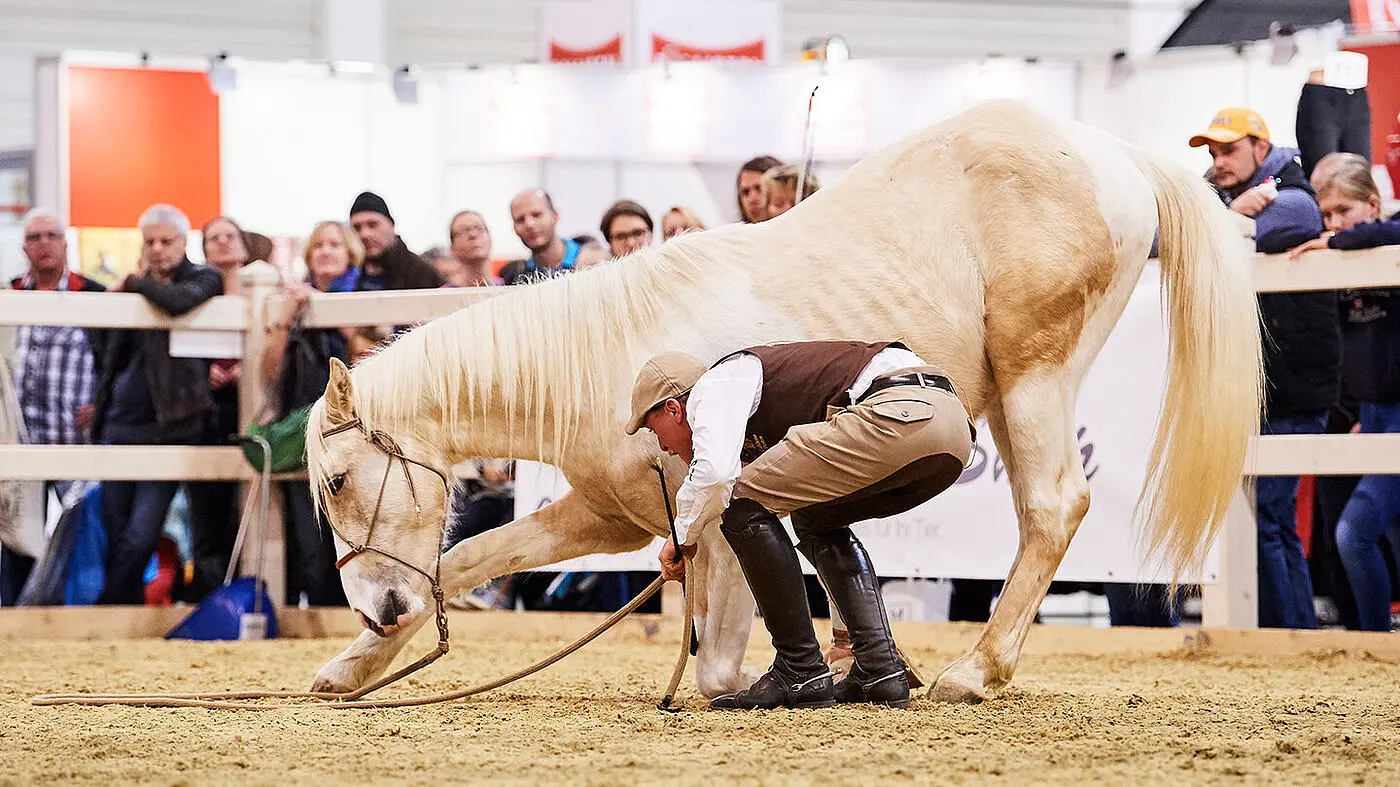"Nicht wegzudenken von der EQUITANA ist die Working Equitation. Das Team um das Gestüt Goldene Pintos und SIGNUM fährt in diesem Jahr groß auf und bringt das wohl pferdereichste Bild der letzten Jahrzehnte in die Arena. Bekannt aus rasanten Speedtrails und Kopf-an-Kopf-Rennen beweisen die Reiter und Pferde diesmal echtes Teamwork in Reih und Glied. Hier tanzt niemand aus der Reihe!"