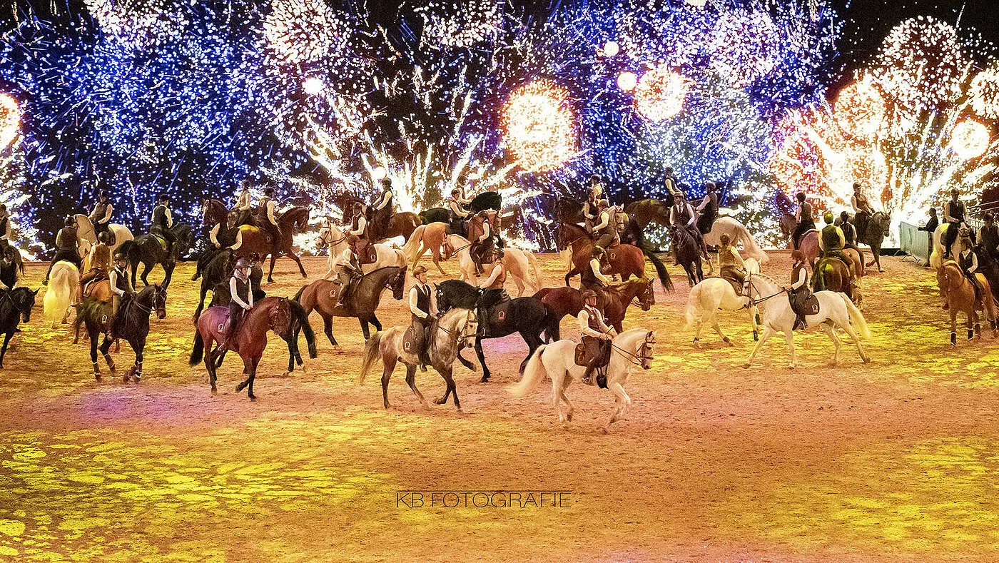 Mitja und seine Pferde beeindrucken durch ihr vielfältiges Können und ihre enge Partnerschaft. Besonders in der Feuer Nummer wird die enge Verbindung zwischen ihnen und das nahezu endlose Vertrauen sichtbar. Mitja Feuer Show besteht aus Elementen der Working Equitation und verschiedenen Dressur- und Zirkuslektionen mit Feuer. Als Highlight demonstriert er den Ritt mit einer brennenden Feuergarrocha.