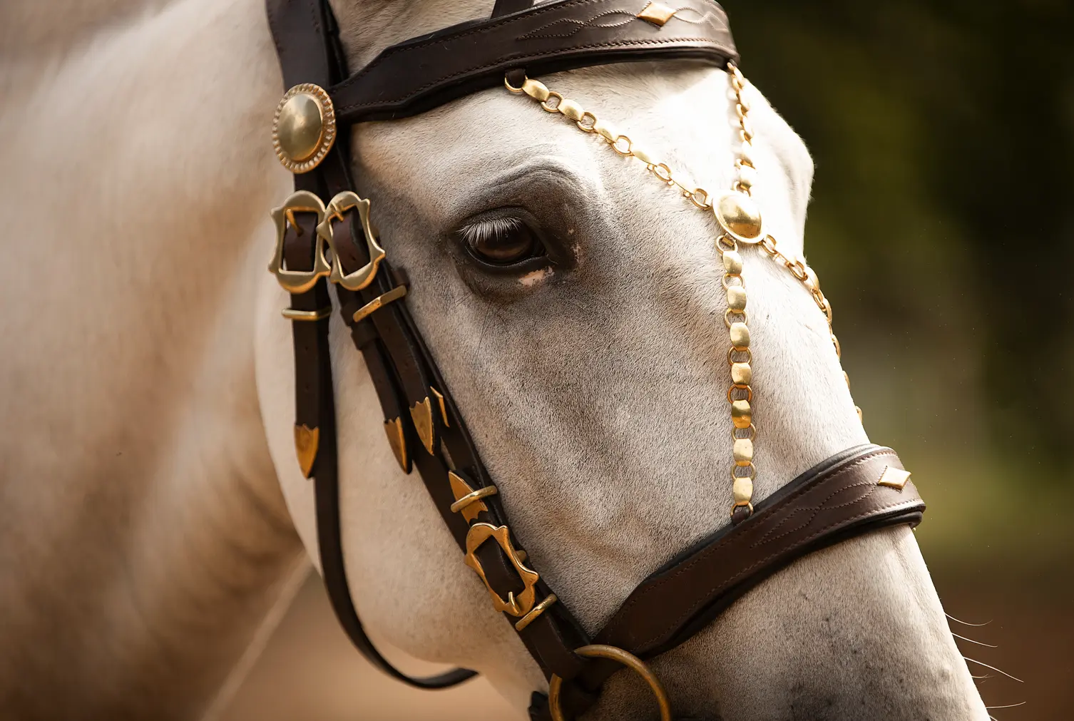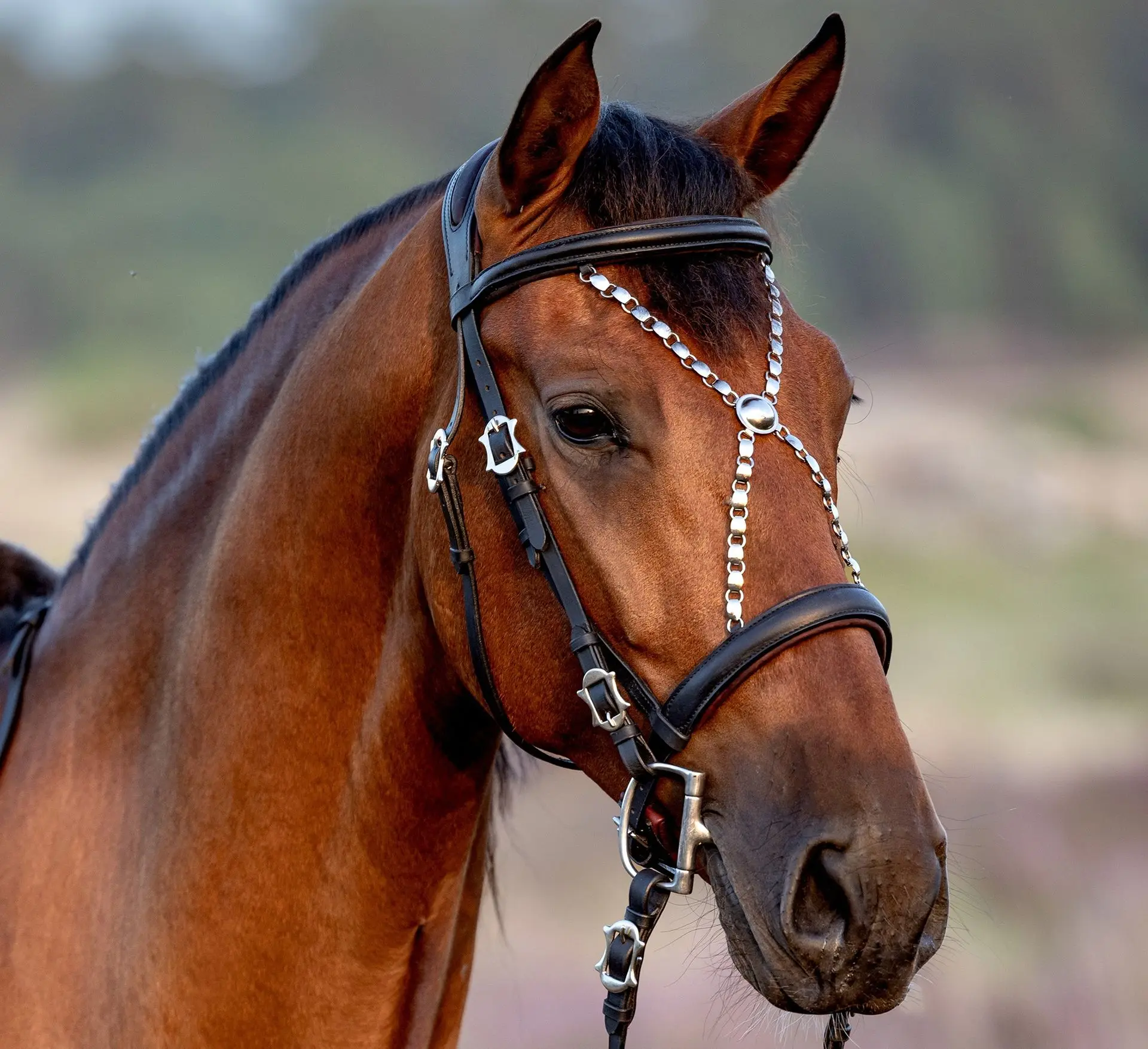 Bei dem Modell "Deluxe" wurde die markante Stirnkette erhalten und die Schnallenform in feinerer Ausführung umgesetzt, jedoch auf die Hiebkette auf dem Genickstück, die rautenförmigen Zierelemente auf Stirn-, Nasenriemen und den Backenstücken verzichtet, um dem Zaum ein elegantes Aussehen zu verleihen. Damit eignet er sich besonders für Pferde mit etwas feineren Köpfchen und für einen klassischeren Look.