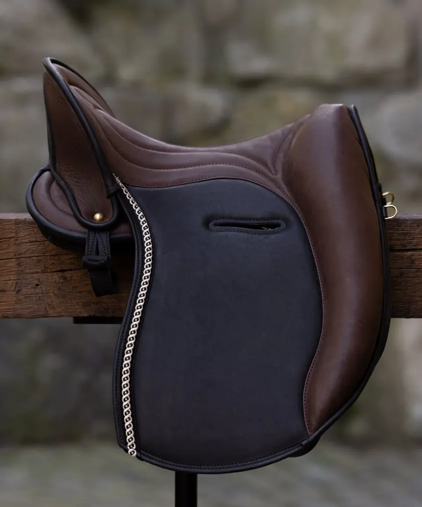Die vordere überlaufende Pausche ist eine Hommage an die Galerie eines spanischen Sattels, gibt dem Reiter jedoch durch die seitlich auslaufende Pausche mehr Halt besonders im Bereich des Oberschenkels und Knies.