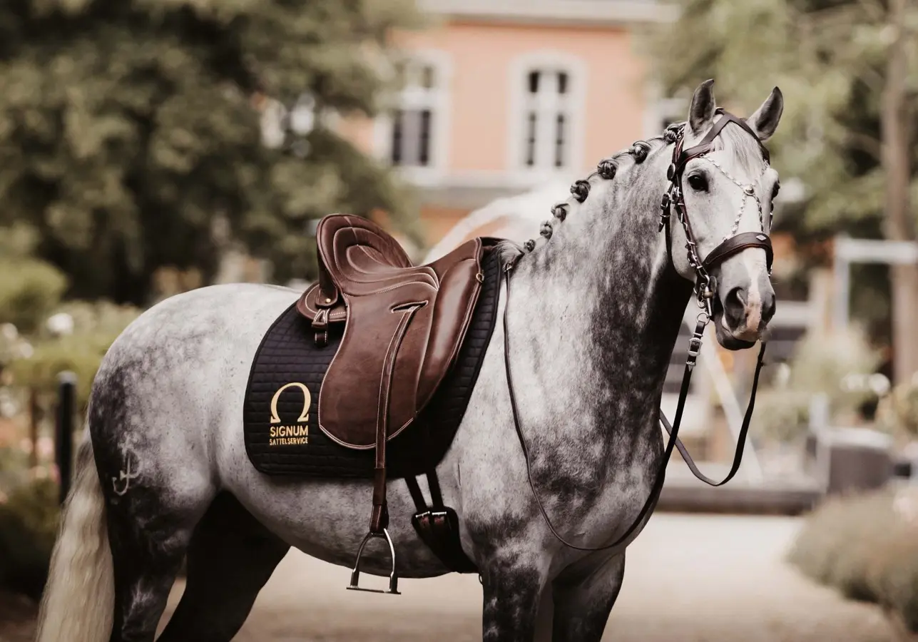 Iberische Rassen brauchen einen Sattel, der auf einen breiten Pferderücken häufig kombiniert mit einer stärker geschwungene Rückenlinie und moderat ausgeprägtem Widerrist ausgelegt ist. Besonders geeignet sind spanische Sättel, barocke Sättel oder flexible Systeme wie das SIGNUM PADDLE®, die Schulterfreiheit bieten und den Rücken nicht einschränken. Sättel mit einer breiten Druckverteilung und weichen Sattelkissen kommen den typischerweise weicheren Rücken und dem häufig schwächer ausgeprägten Bindegewebe bei iberischen Pferden zugute, da sie korrekt angepasst Druckspitzen und punktuelle Druckverteilung vermindern.