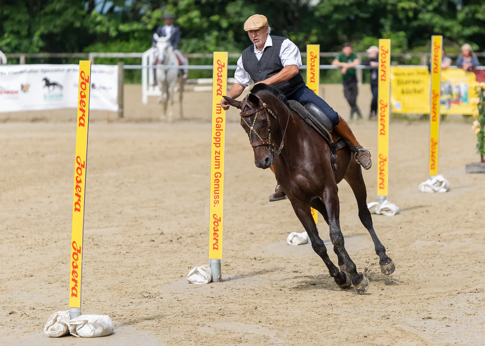 - den Parallelslalom, bei dem der Reiter zwei Slalomreihen bogenförmig umreitet.