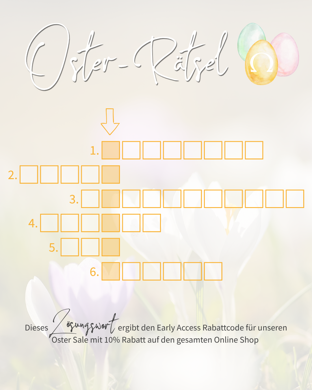 Ab sofort könnt ihr euch den 10% Rabatt schon 24 Stunden vor dem offiziellen Start unseres Oster Sales sichern. Alles, was ihr dafür tun müsst: unser Kreuzworträtsel lösen und euch den Code selbst zusammensetzen.