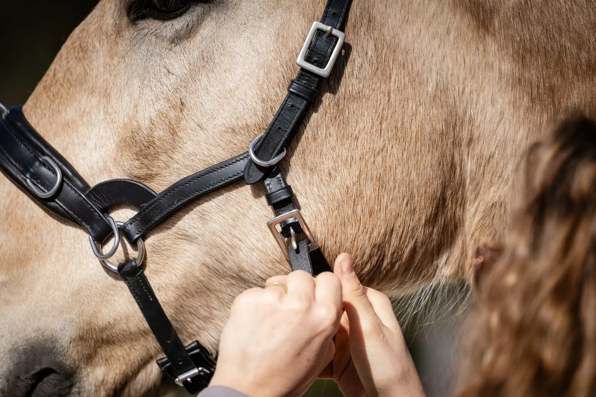 - Er darf nicht zu tief sitzen – zu tiefe Positionen beeinträchtigen Atmung und Stabilität. Gleichzeitig müssen zwei Finger zwischen Pferdekopf und Nasenriemen passen.