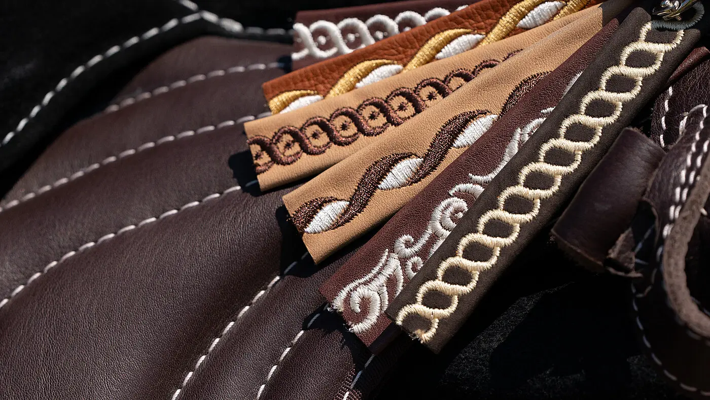 Machen Sie Ihr Design zu einem absouluten Eycatcher. Die edle, gestickte Bordüre am seitlichen Blatt macht ihr PADDLE® bzw. Reitpad zu einem unverwechselbaren Unikat. Diese gestickten Bordüren sind ein Designelement von unseren Maßsätteln, welches wir auch an unseren Reitpads und dem PADDLE® als besonderes Highlight anbieten. Wählen Sie aus unterschiedlichen Stickmustern & Nahtfarben. In einem weiteren Schritt wählen Sie die Farbe des Leders, auf dem die Bordüre gestickt wird und bekommen damit eine weitere Möglichkeit, Akzente zu setzen.